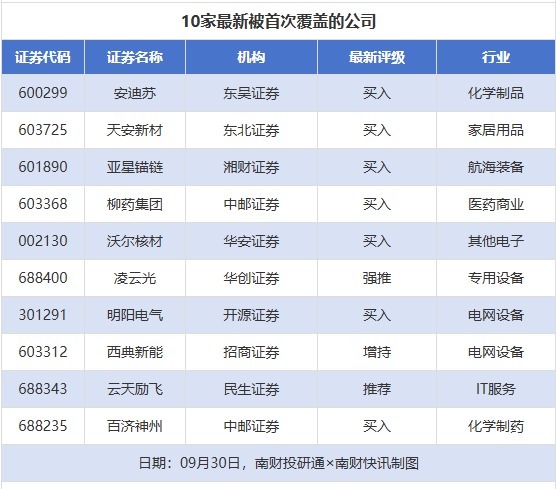 首次覆盖方面,9月30日券商共给出了10次首次覆盖,其中安迪苏获得东吴证券给予“买入”评级,天安新材获得东北证券给予“买入”评级,亚星锚链获得湘财证券给予“买入”评级,柳药集团获得中邮证券给予“买入”评级,沃尔核材获得华安证券给予“买入”评级。