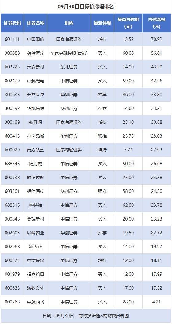 目标价方面,9月30日,券商给予上市公司目标价共21次,按最新收盘价计算,目标价涨幅排名居前的公司有中国国航、稳健医疗、天安新材,目标价涨幅分别为70.92%、56.81%、43.59%,分别属于航空机场、个护用品、家居用品行业。