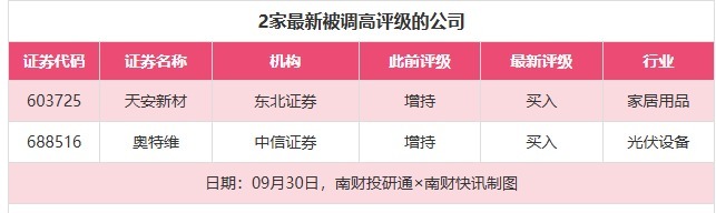 评级调高方面,9月30日,券商调高上市公司评级为2家次,最新数据包括了东北证券对天安新材的评级从“增持”调高至“买入”,中信证券对奥特维的评级从“增持”调高至“买入”。